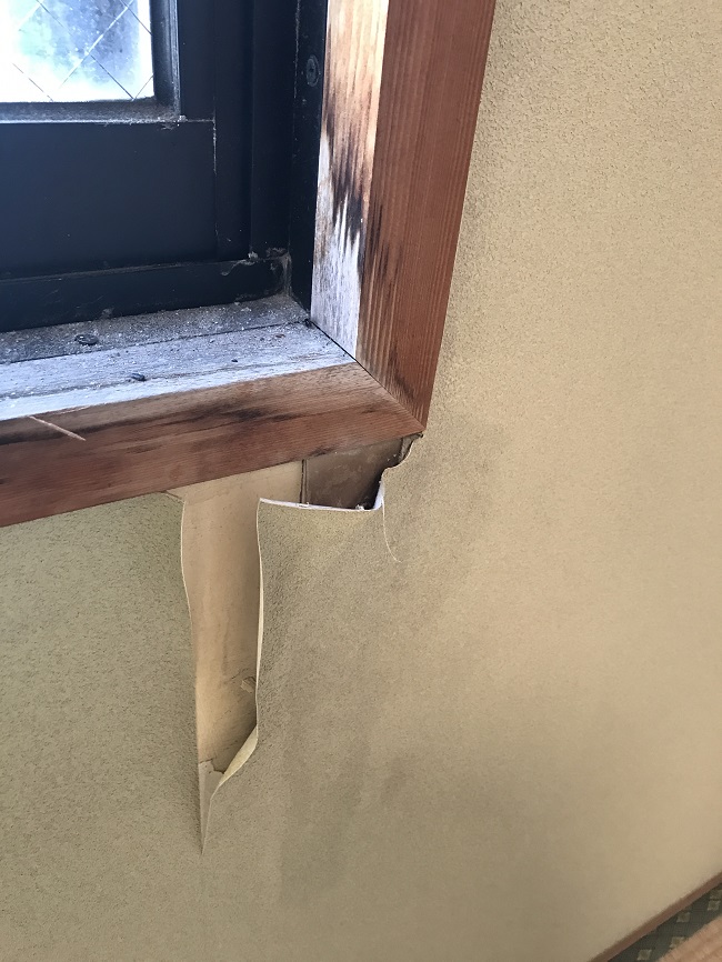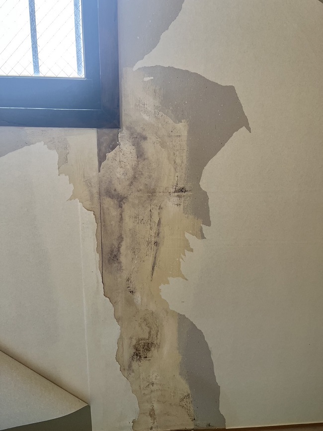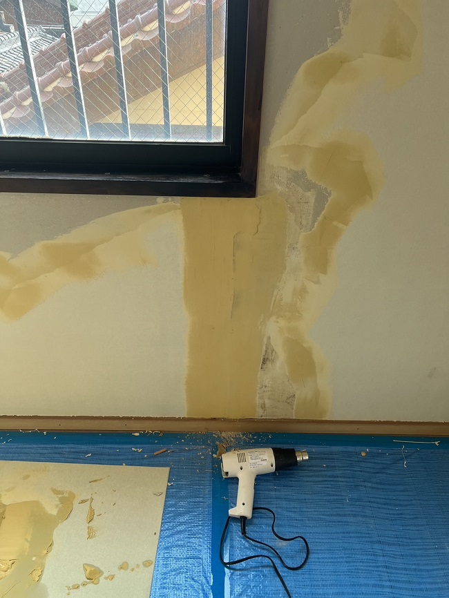 ※左が既設のクロスを剥がした時の状態。右がパテで下地の補修をした状態。