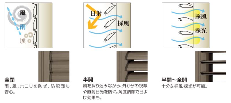 可動部を開くことで直射日光を遮り、プライバシーを守りながら採風・採光することができ、室内環境を快適にコントロールします。