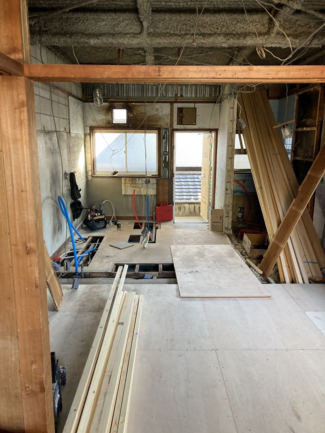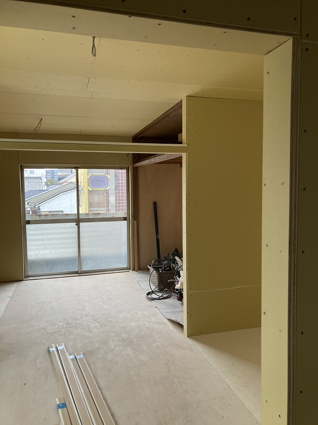 ↑このままではクロスや床材が貼れないので、天井・壁・床の下地を作っていきます。