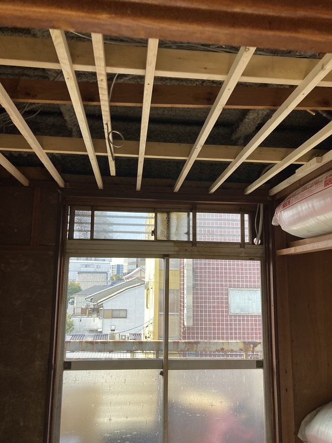 ↑天井下地を作っています。ここに断熱材を入れ、プラスターボードで塞ぎます。