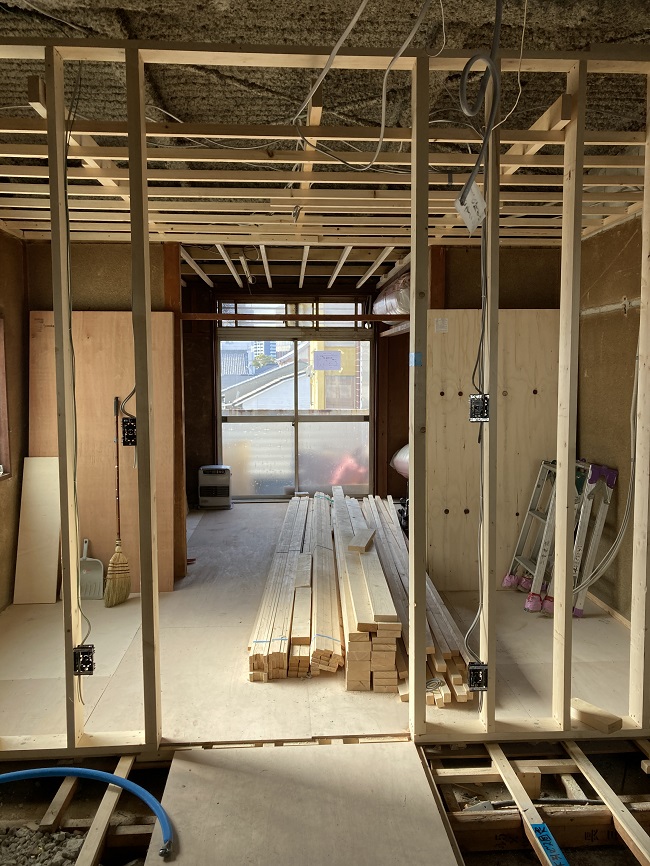 ↑天井・壁・床の下地を作っています。新たに立ち上げる壁には、同時にコンセントの配線も行っています。