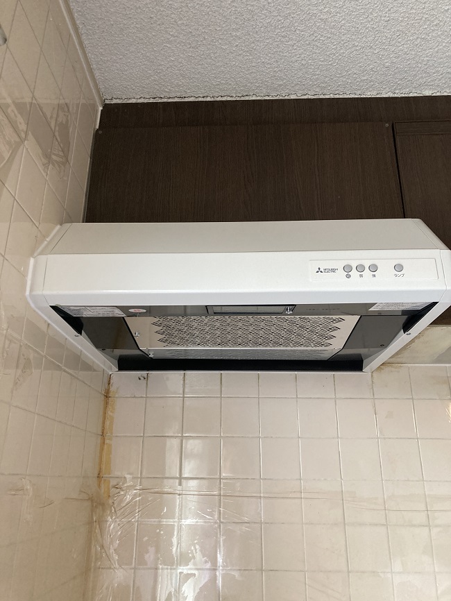 既設の換気扇のサイズに合わせた浅型のレンジフード【三菱電機】に交換。