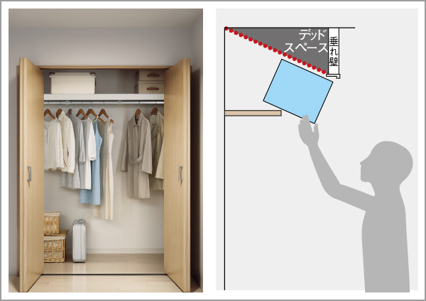 床から天井までの扉にすることで、枕棚収納の使い勝手が良くなり物の出し入れがストレスなく行えます。(※下記の画像を参照してください)