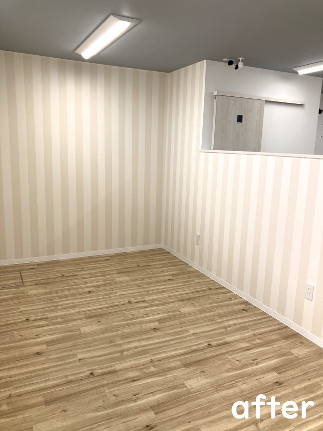 コントラストの低い淡いカラーを使用した、カジュアルな印象の線の太いストライプ柄を採用し、空間を広く見せつつ落ち着きのあるスペースに。