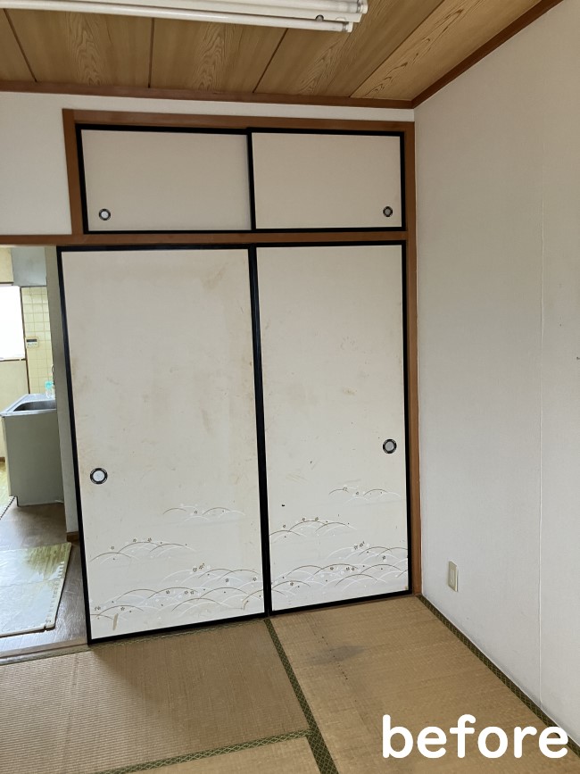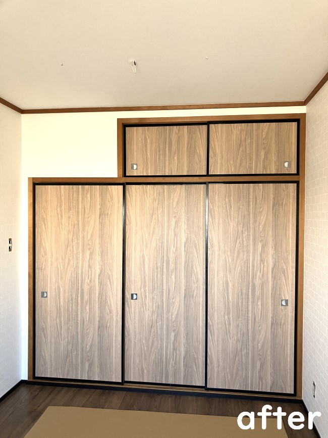 2階の和室にあった襖は、洋室へのリフォームに伴い木目調の襖紙を採用しました。
