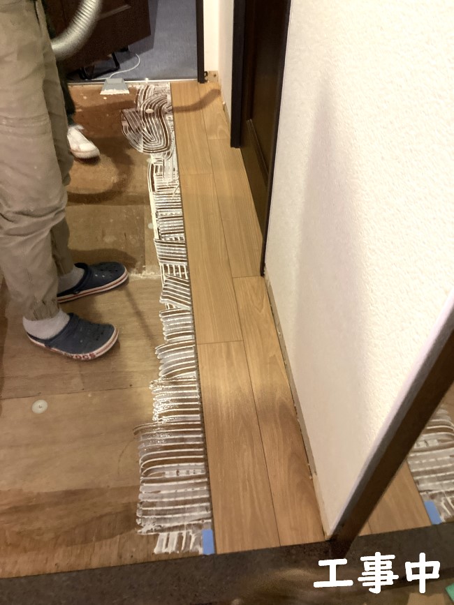 ↑フローリング施工中。今回のフローリングは、専用接着剤で敷設しています。