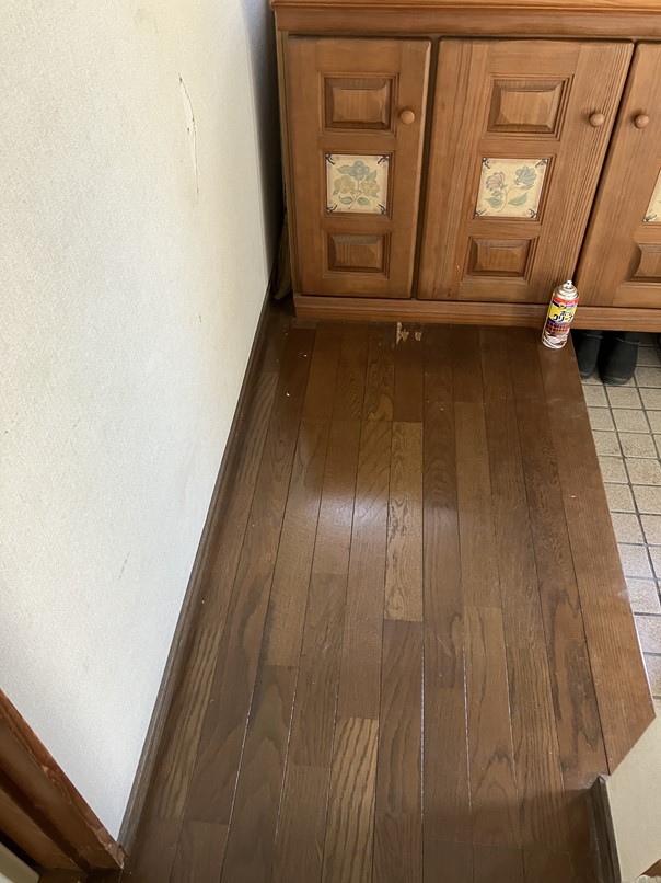 シューズボックスのすぐ手前のフローリングも傷んでしまっています。