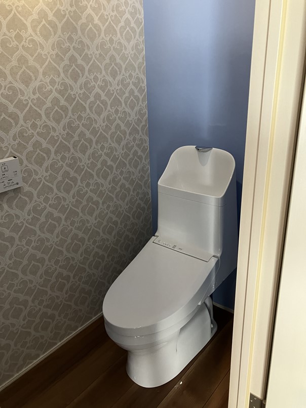 トイレは爽やかなライトブルーをベースに、アクセントクロスをチョイスされました。