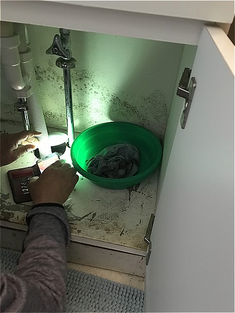 収納スペースの水漏れにより、水が染みた跡がはっきりわかるぐらいの濡れ具合でした。