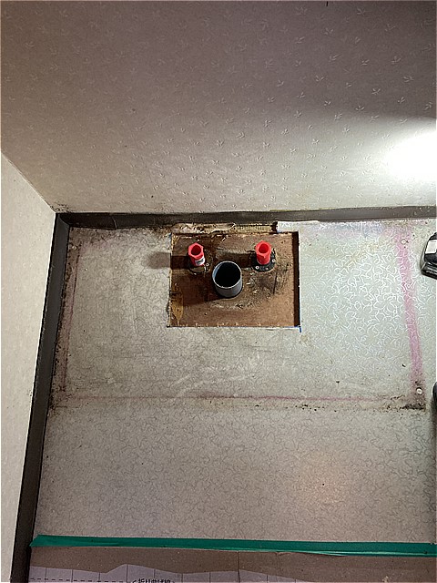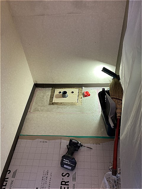 クッションフロアをカットし、腐食している床板部分もカットして、新たな合板を敷設します。