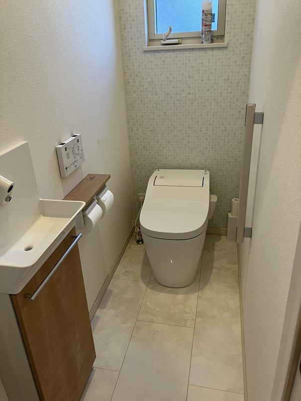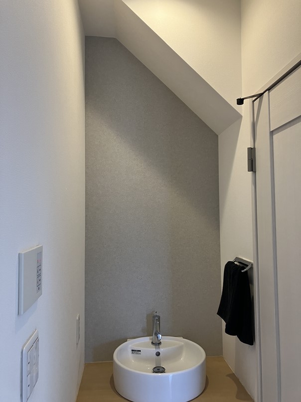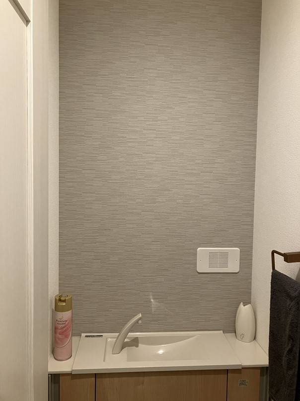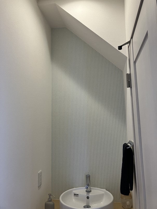こちらのアクセントクロスは、1階のトイレと同じクロスにしてトイレ空間のテイストを合わせています。
