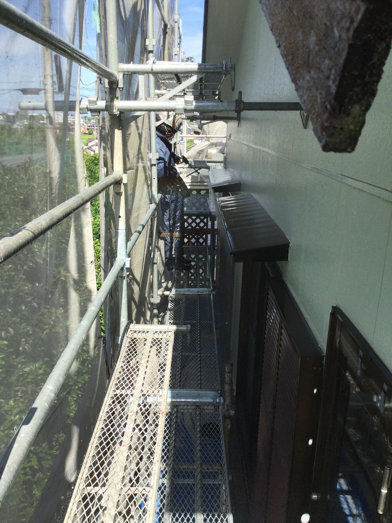 塗装前に高圧洗浄で壁の汚れを落とします。