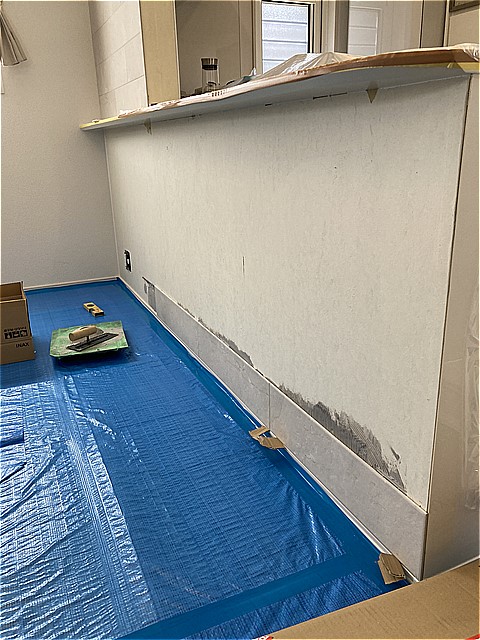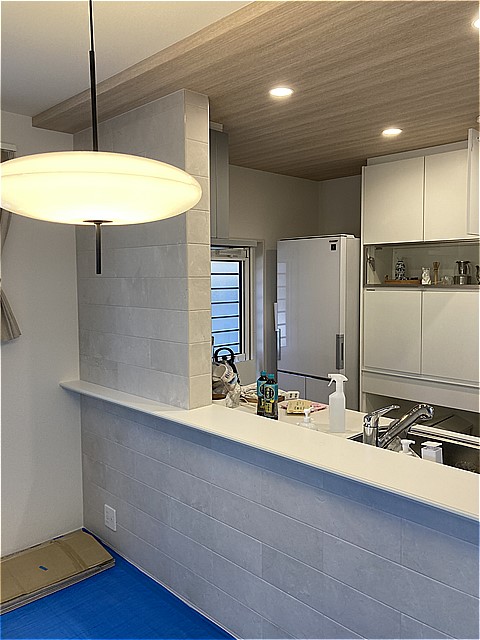 キッチン前の壁にエコカラットを貼ってほしいとのご希望がありましたので、