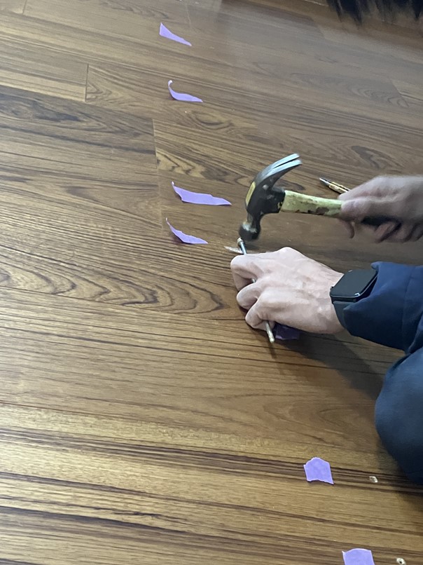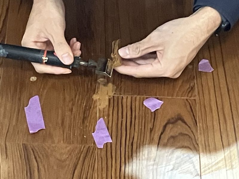 以前ご紹介させていただいた壁撤去工事の際に、床に残った釘跡などを補修していきます。