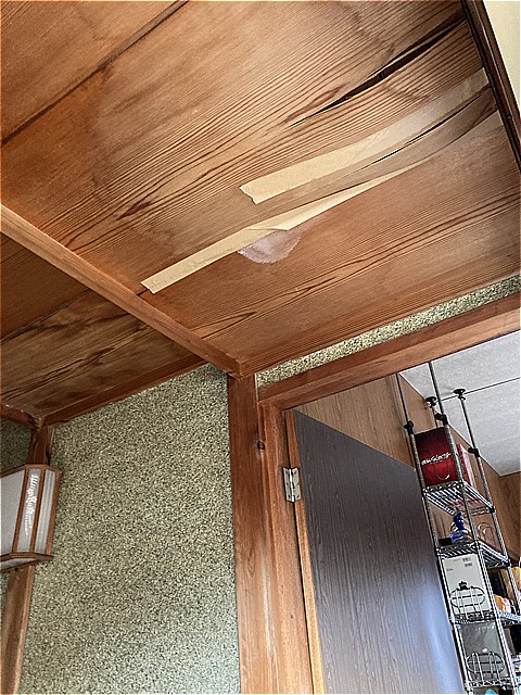 同じく玄関の天井の一部も剥がれてきており、ガムテープで補修してありました。
