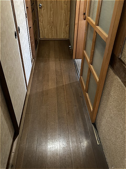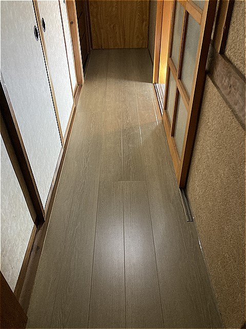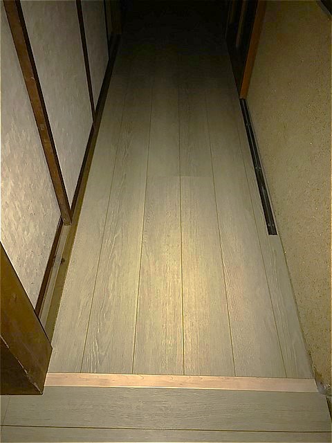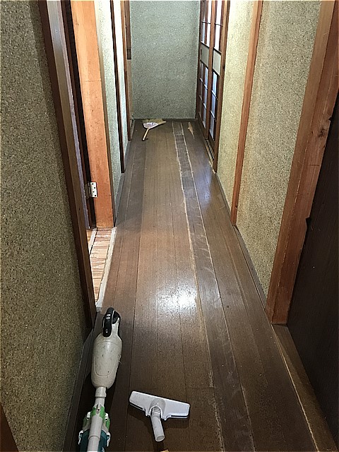 廊下の凸凹もまっすぐに上貼りできるように丁寧に削り凸凹をなくしていきます。