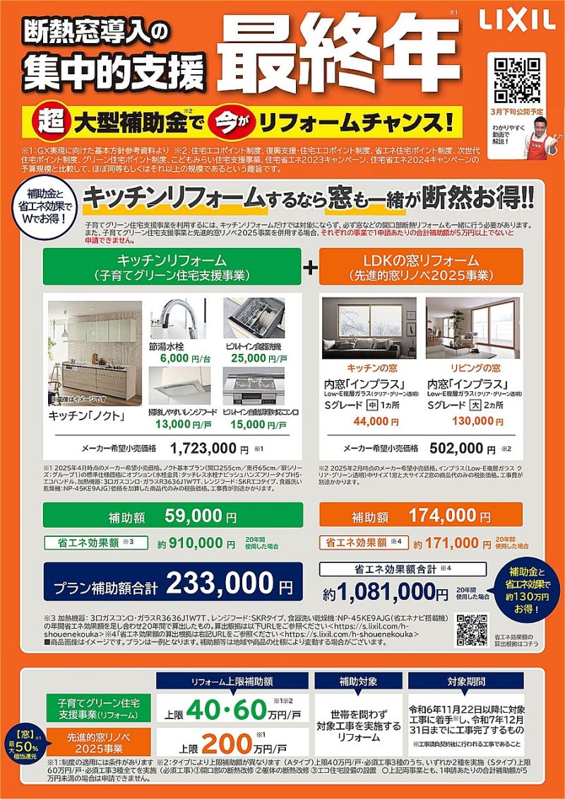*キッチン設備の補助金制度を利用するには、開口部断熱リフォーム(内窓設置など)も一緒に行う必要があります。