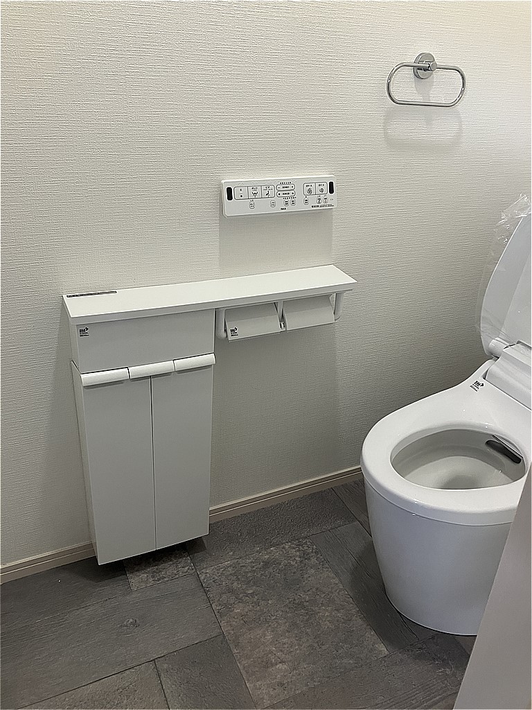 母屋で取り付けて使い勝手が良いとのことで、こちらにも壁付収納棚(紙巻器付)を設置させていただきました。