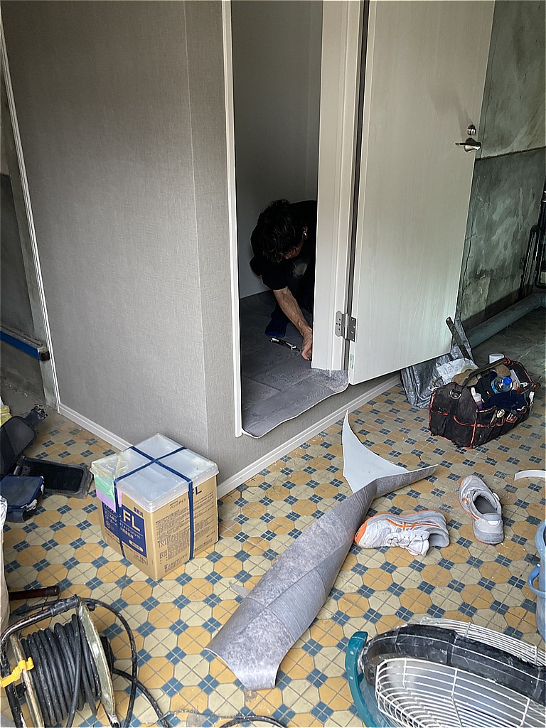 クロスが貼り終わったら、床にクッションフロアを貼ります。