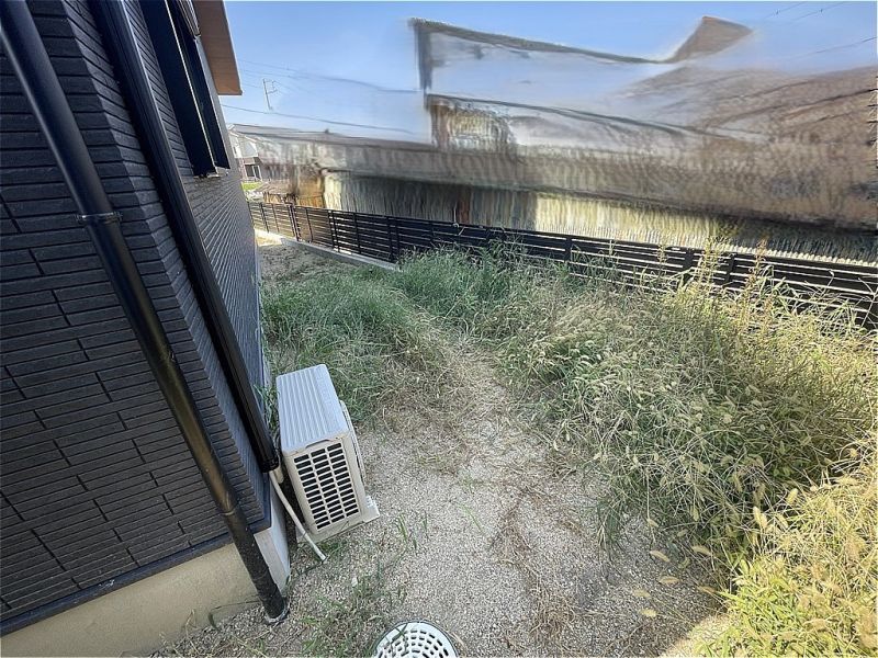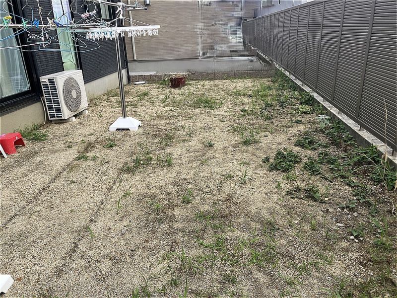 フェンス脇の部分は植物を植えられるよう、人工芝を張らずに土を残しました。