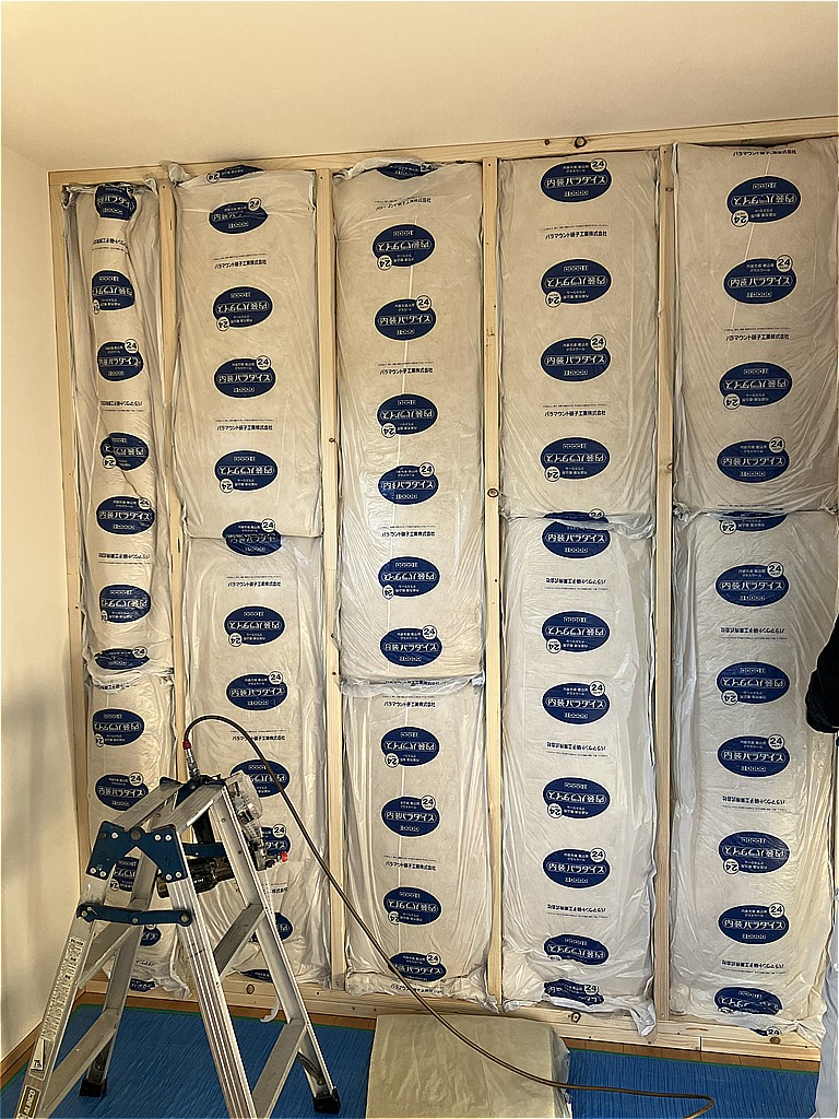今回はお客様のご要望で、お部屋同士の音が響きにくくなるよう、グラスウールを壁に充填しました。