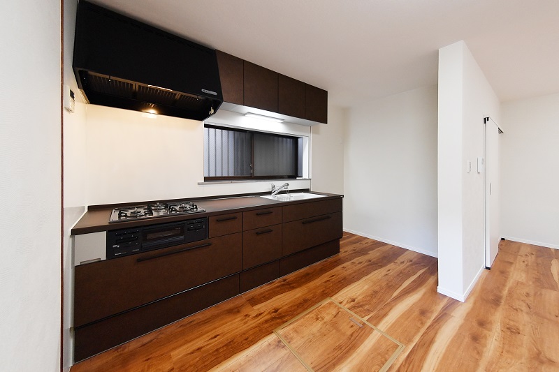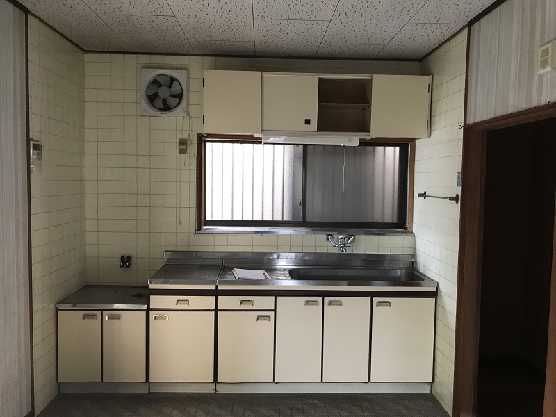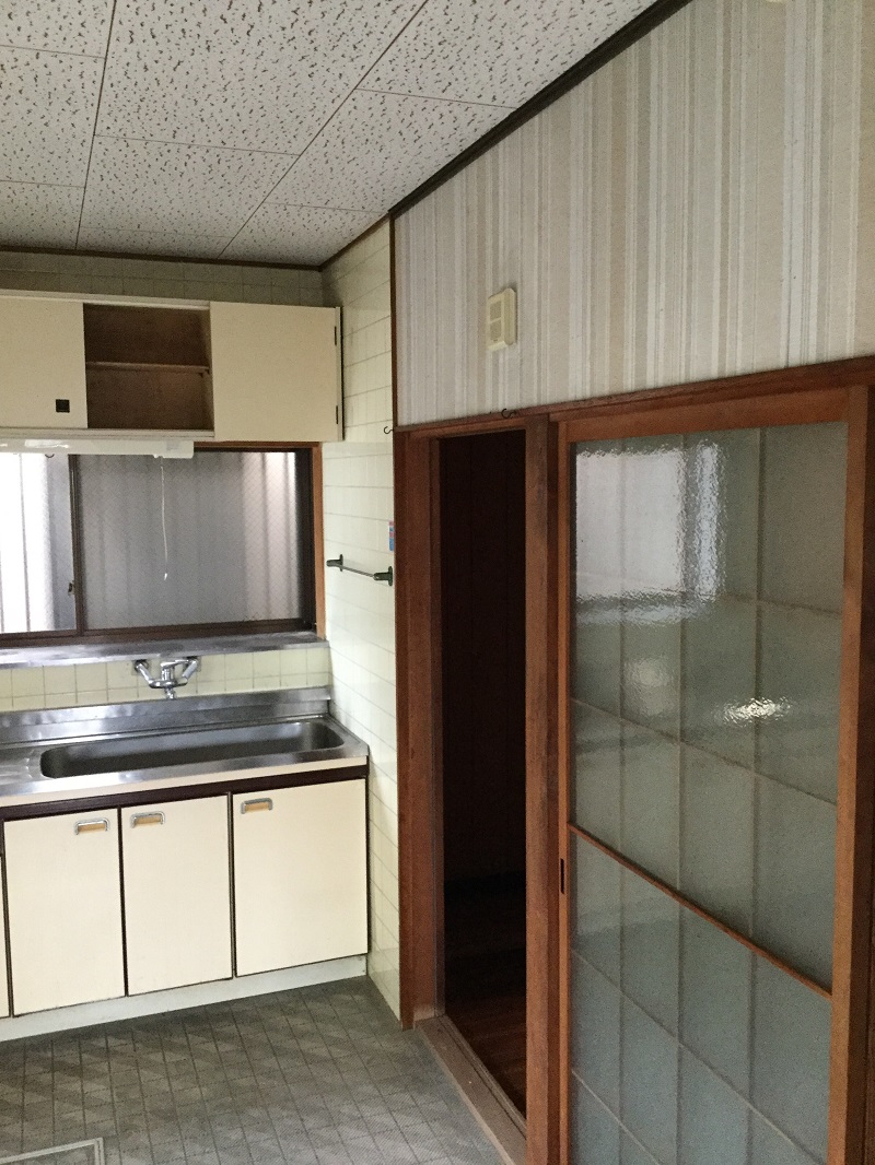 システムキッチンの横には、廊下へ続くガラス戸の出入り口がありましたが
