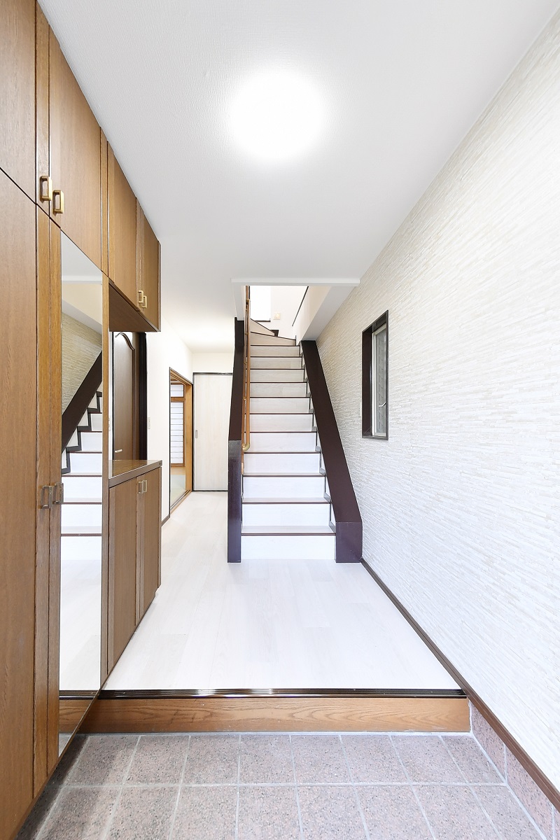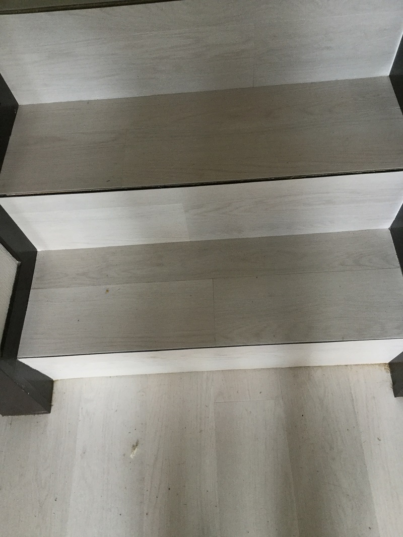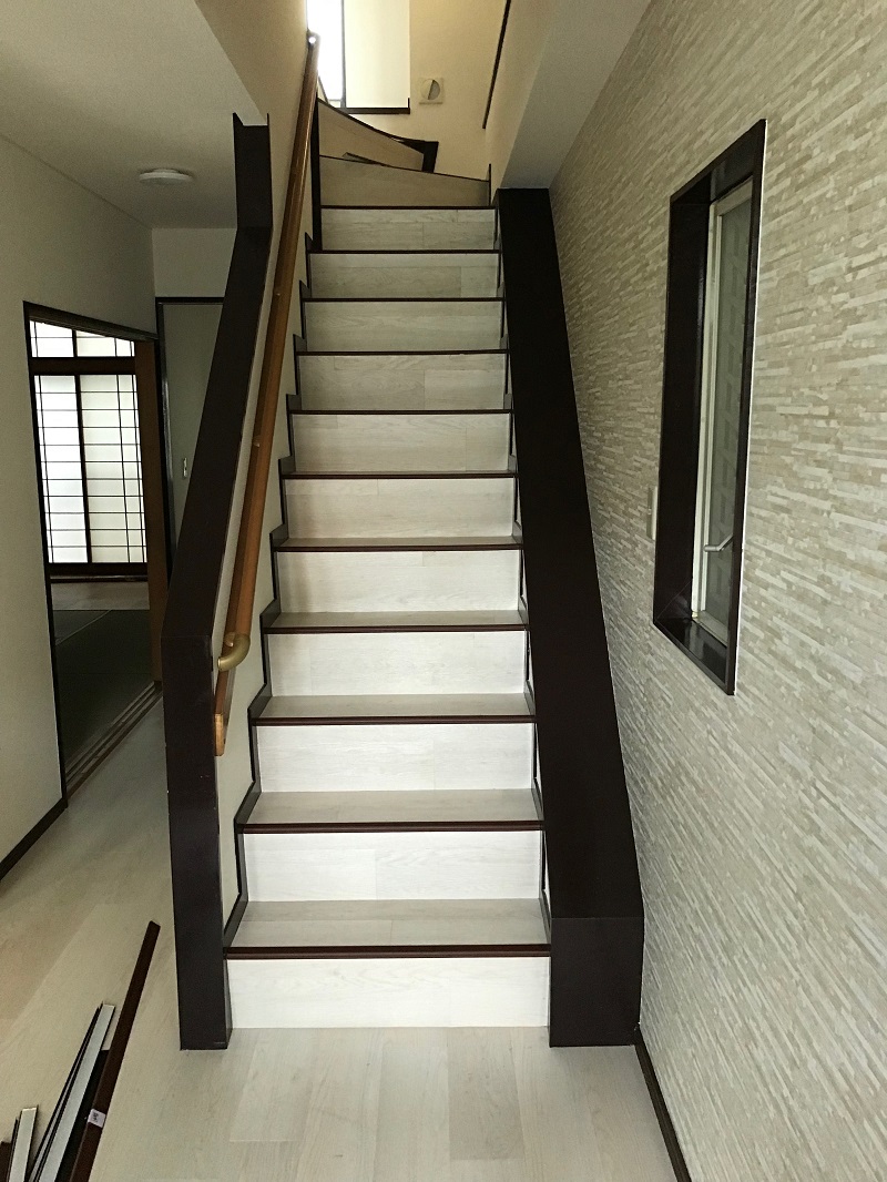 階段も廊下と同じカラーで重ね貼りしています。
