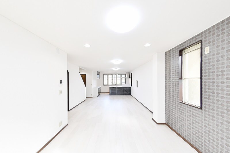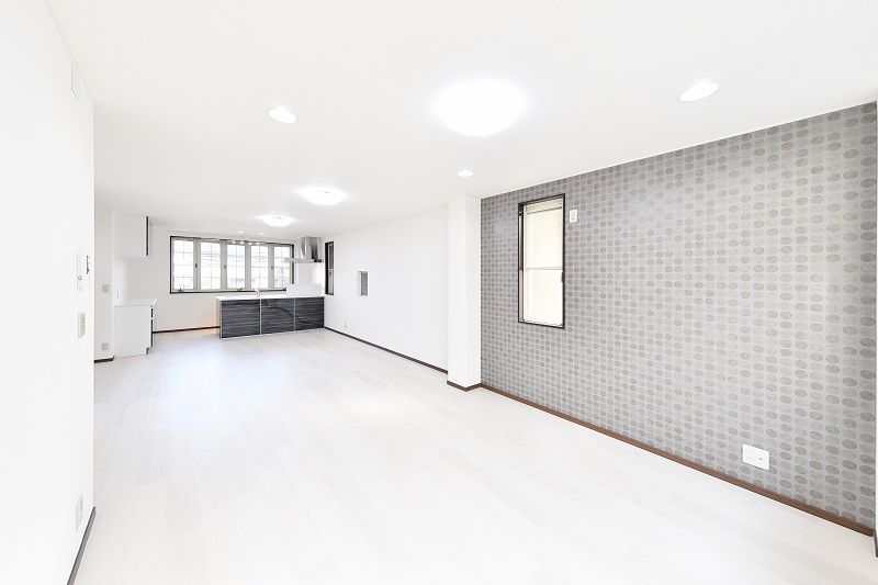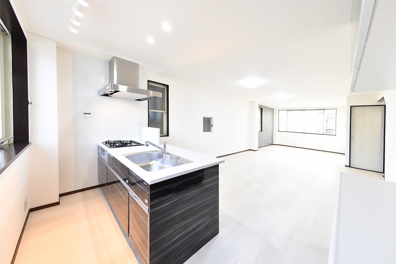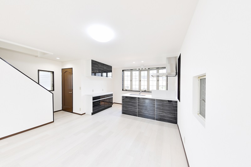 こちらは3階建ての建物で、2階にキッチン・リビングダイニングルーム・トイレ・造作洗面カウンターとなります。