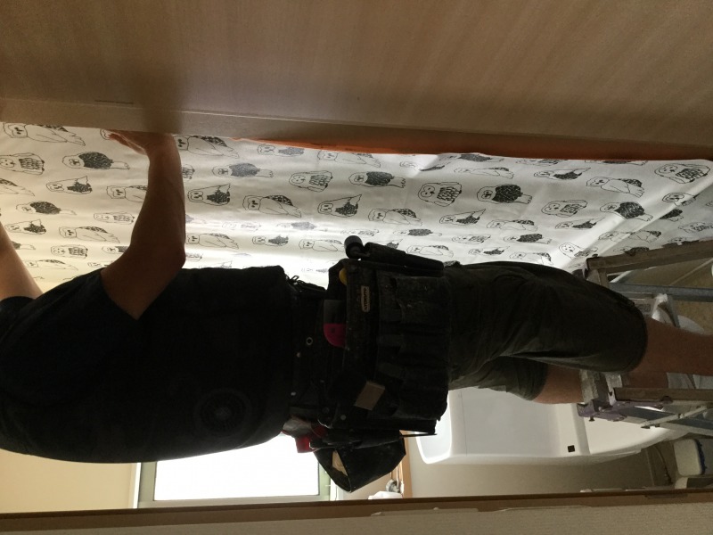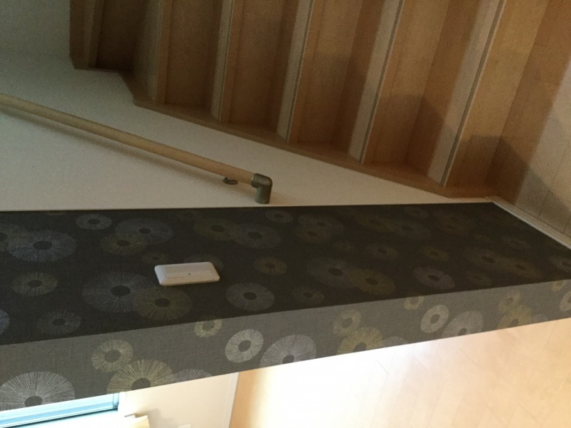 テレビ面のアクセントクロスは、階段まで見切りを入れ、きれいに仕上がりました。