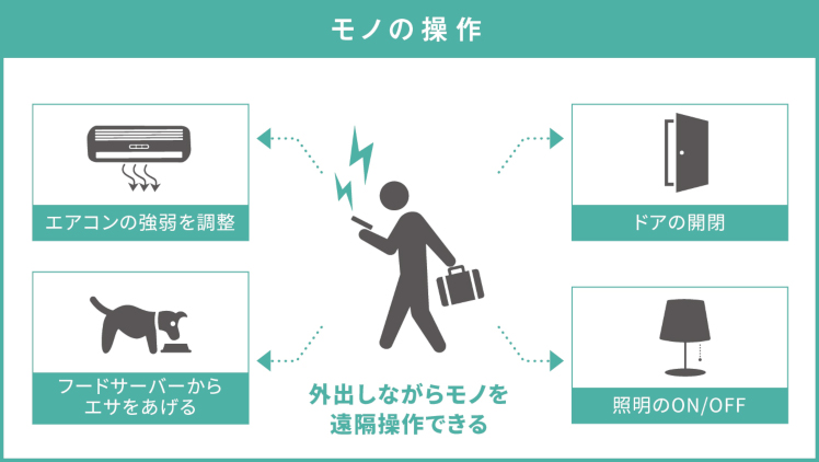 例えば、 外出先から家のエアコンをONにしたり、お風呂を湯沸しをしたり、